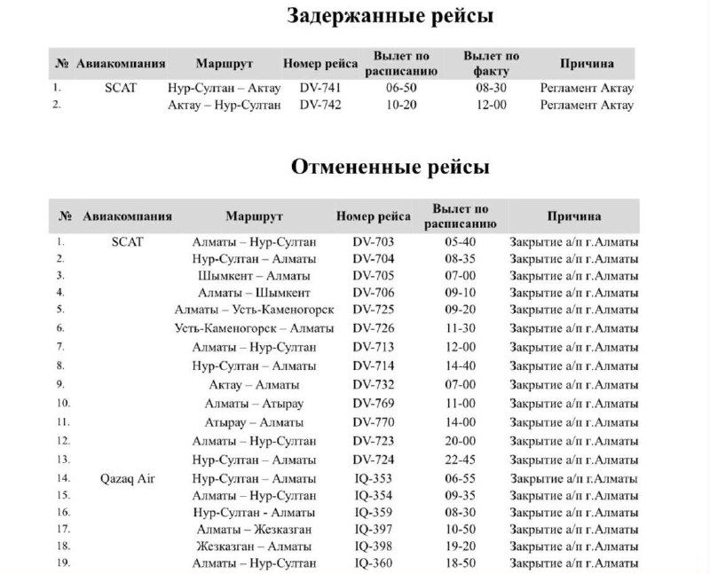 Из них с задержались два рейса, 102 были отменены. Основные причины всех задержек и отмены рейсов – закрытие аэропорта Алматы.