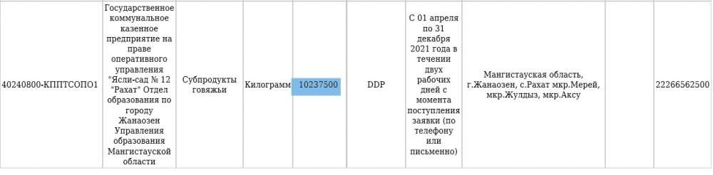 готово закупить 10 миллионов килограммов мяса. Даже если учесть, что это годовой закуп, то получается, что на одного ребенка (от трех до шести лет) придется по 11,7 тысячи килограммов мяса в год. Для сравнения, взрослый казахстанец в среднем съедает в год всего лишь 21 килограмм мяса.