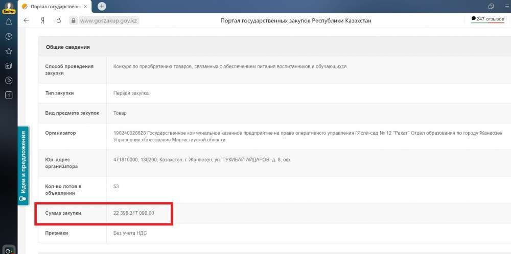 BaigeNews.kz. Детский сад в городе Жанаозене Мангистауской области объявил тендер на приобретение товаров, связанных с обеспечением питания воспитанников и обучающихся, на сумму свыше 22,3 миллиарда тенге. Об этом сообщил Михаил Козачков в своем