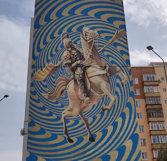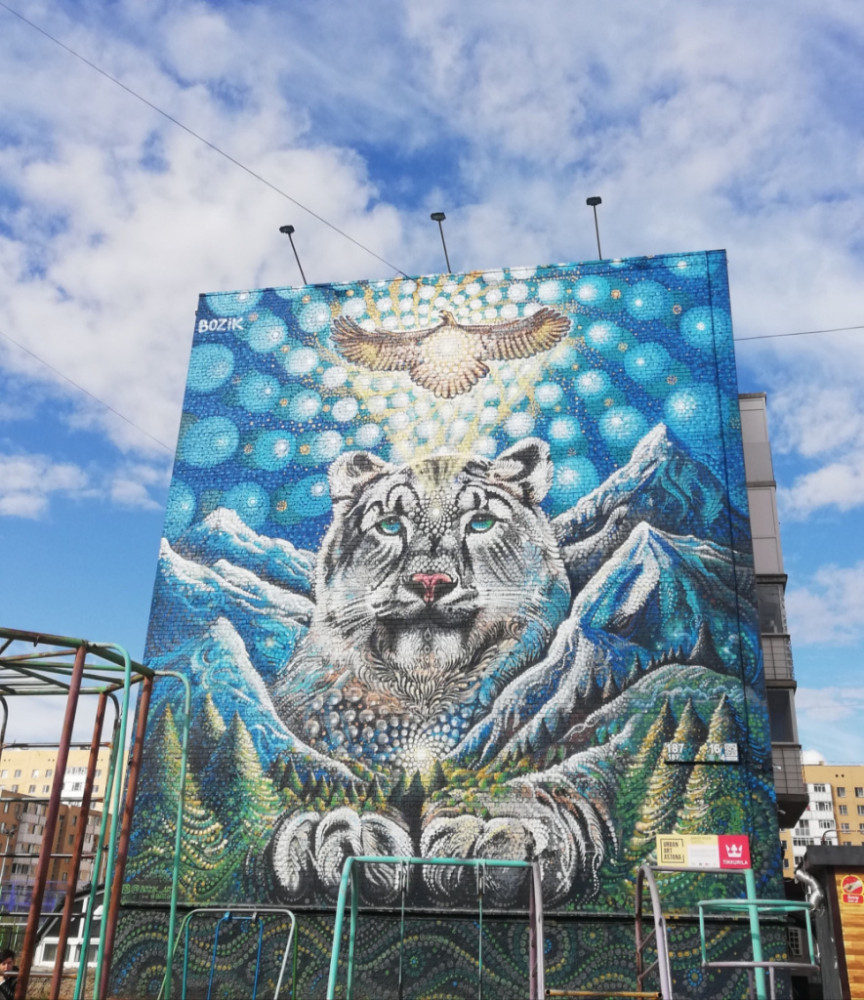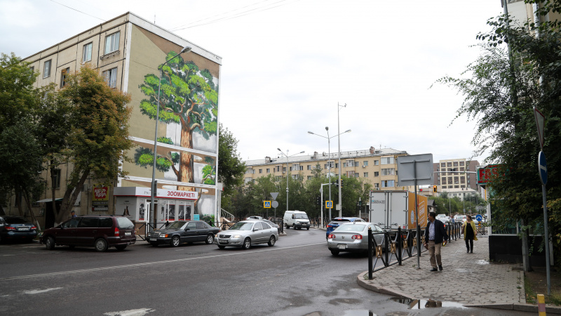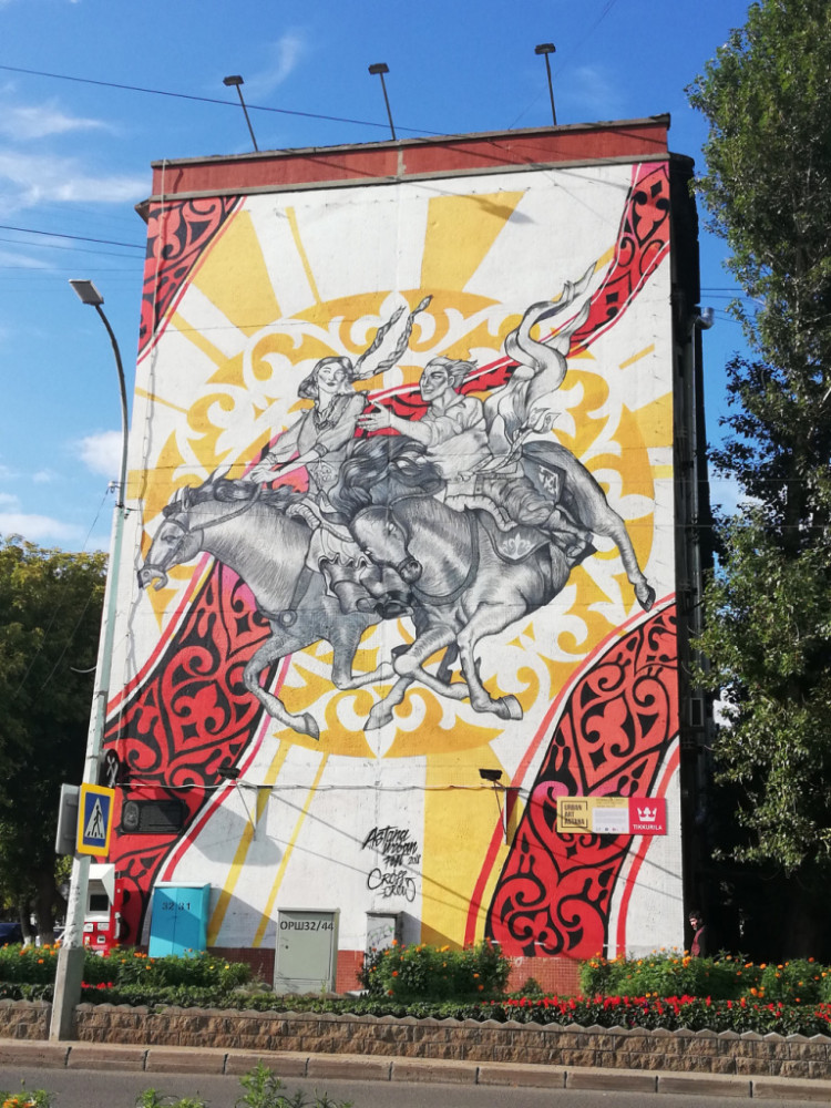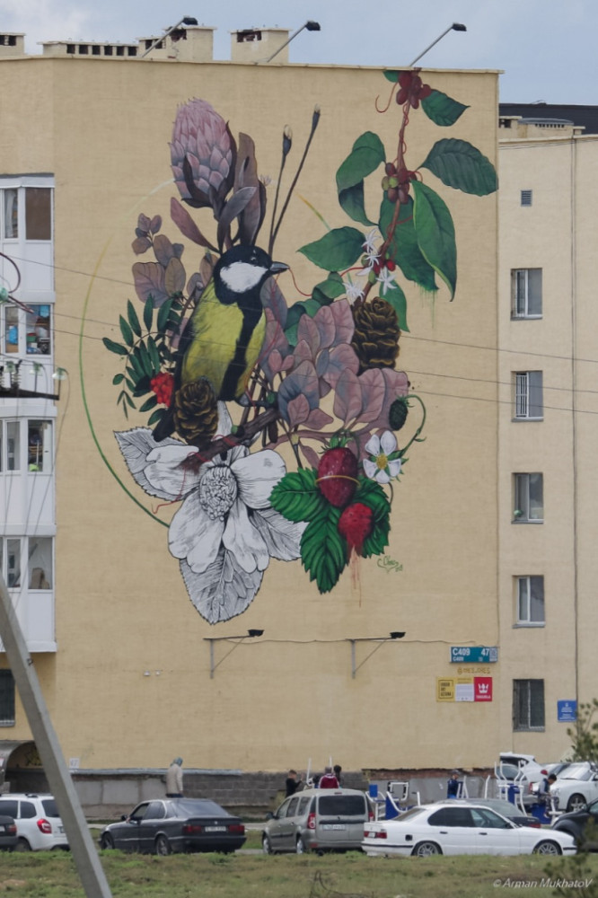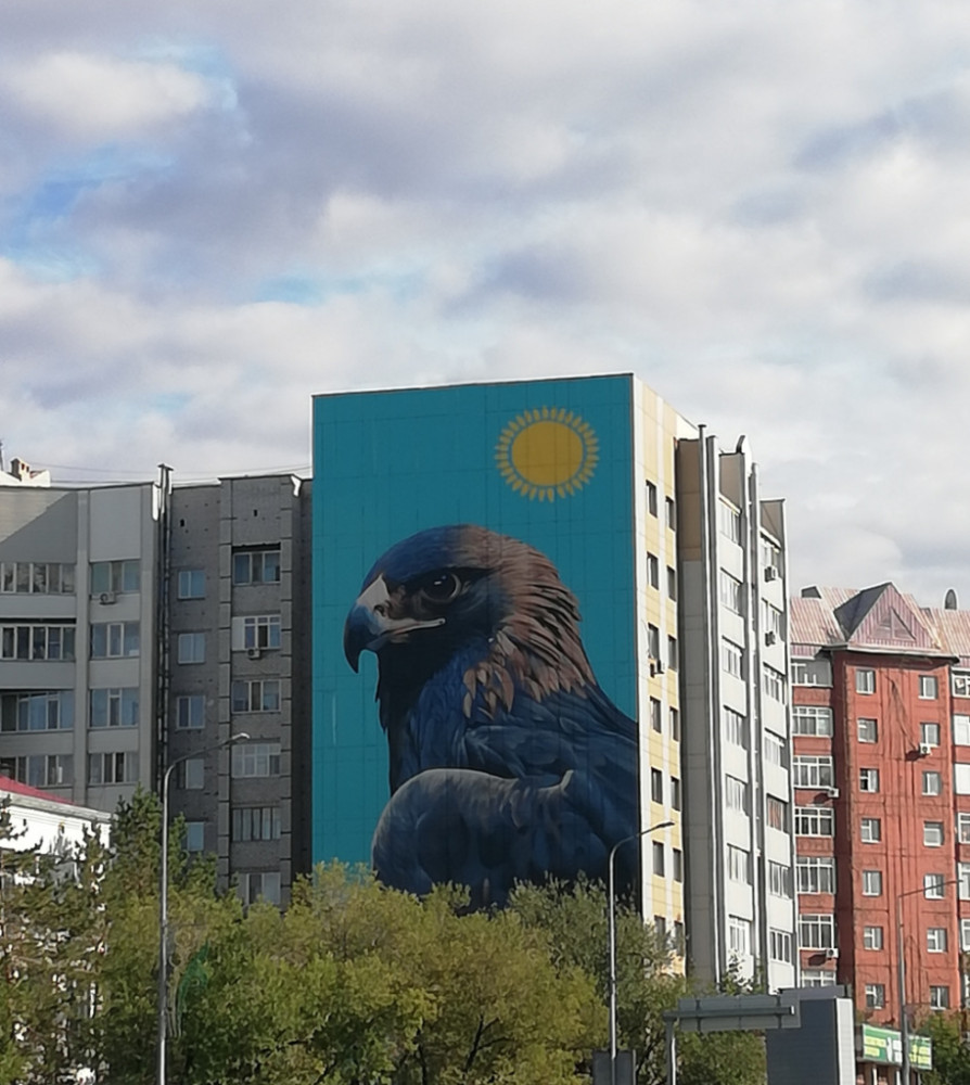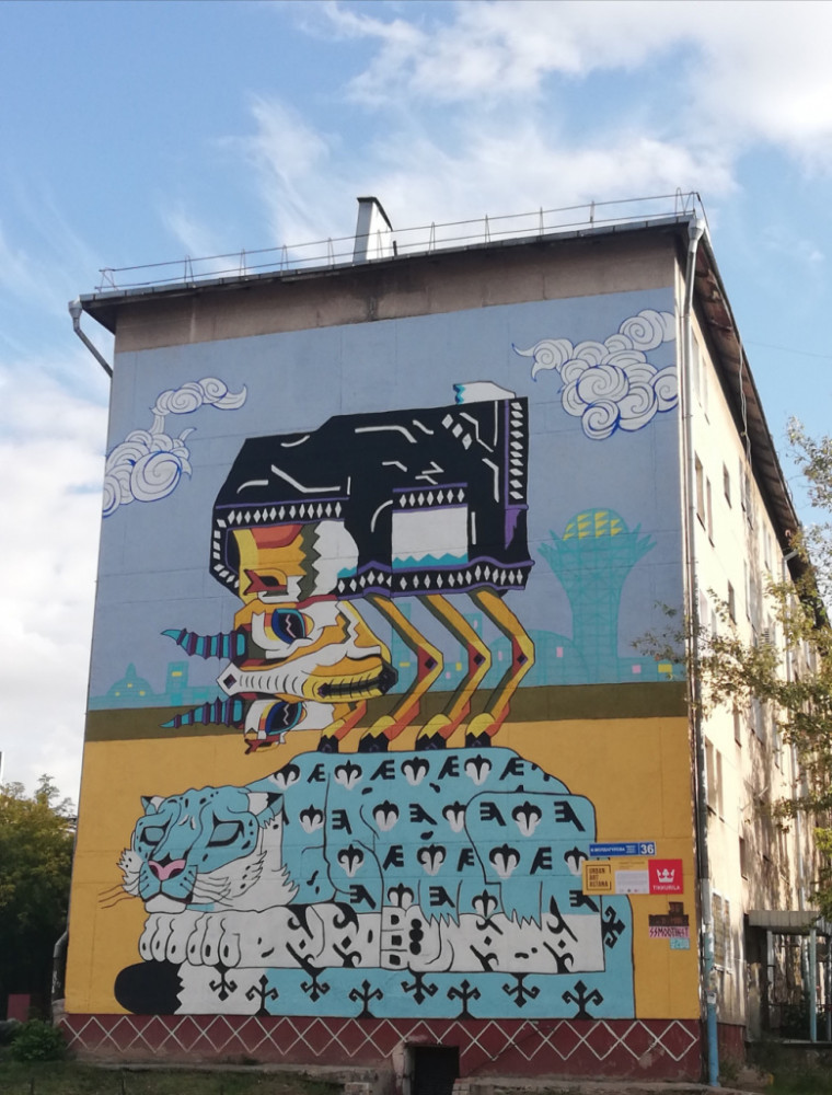 "Мурал реализовался в этом году. Во время разработки эскиза Илья провел тщательные исследования. Очень много прочитал о казахской культуре. Работу реализовали за пять дней. Илье помогал его партнер Артур Кашак", — рассказывает Камбекова.