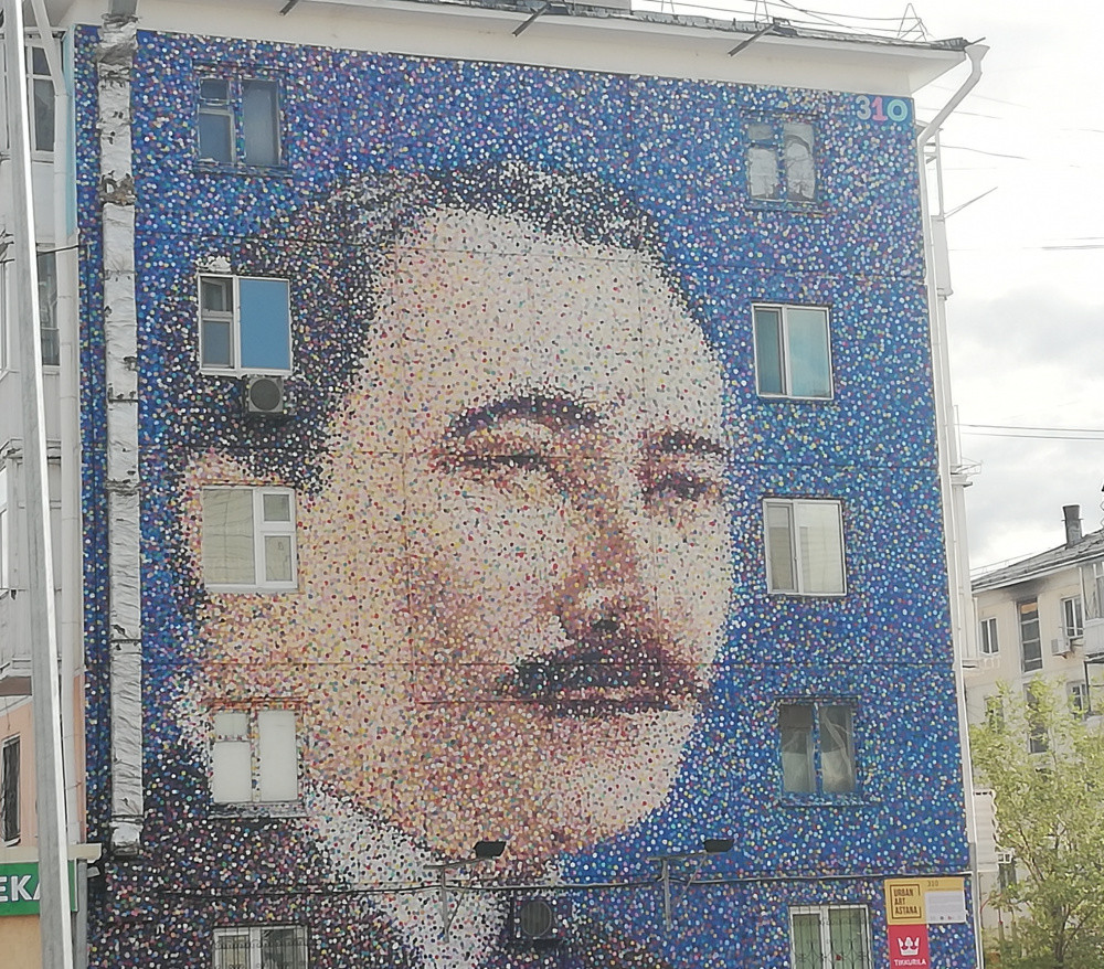"Портрет Сакена Сейфуллина создавался в стилистике неопуантилизма", — говорит спикер. Как отмечает Камбекова, это один из самых узнаваемых муралов в городе.