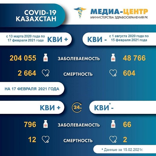 По данным Министерства здравоохранения РК, 15 февраля зарегистрировано 12 летальных исходов заболевания при положительном тесте на COVID и два - при отрицательном.