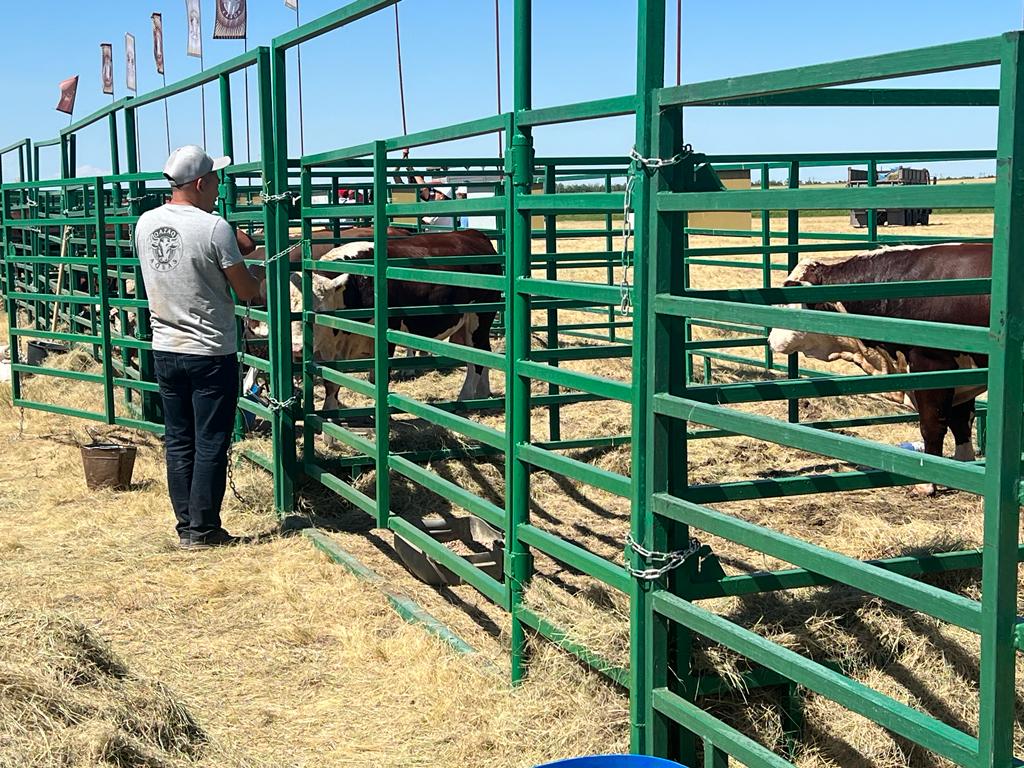 Нурлан Малаев приехал из Северо-Казахстанской области. Вместе с коллегами они привезли герефордов, он разводит быков английской породы уже одиннадцать лет.