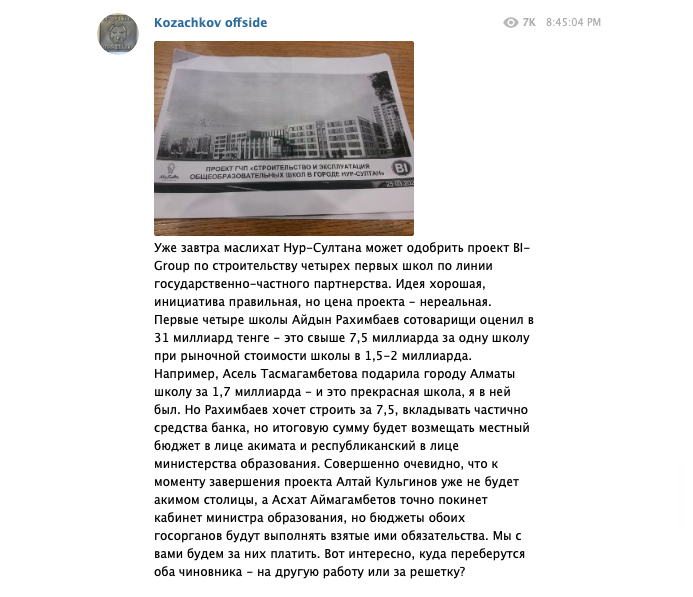 Ранее журналист Михаил Козачков сообщил, что 31 марта в депутаты маслихата Нур-Султана может одобрить проект BI Group по строительству четырех первых школ по линии государственно-частного партнерства."Получается, город будет переплачивать из кармана налогоплательщиков 110-120 миллиардов тенге. Что это за липовые "инвестиции"? Разве не выгоднее городу самому за 30-40 миллиардов построить эти самые школы, чем потом годами расплачиваться за чужой кредит в четыре раза дороже?", - задаются вопросом депутаты.