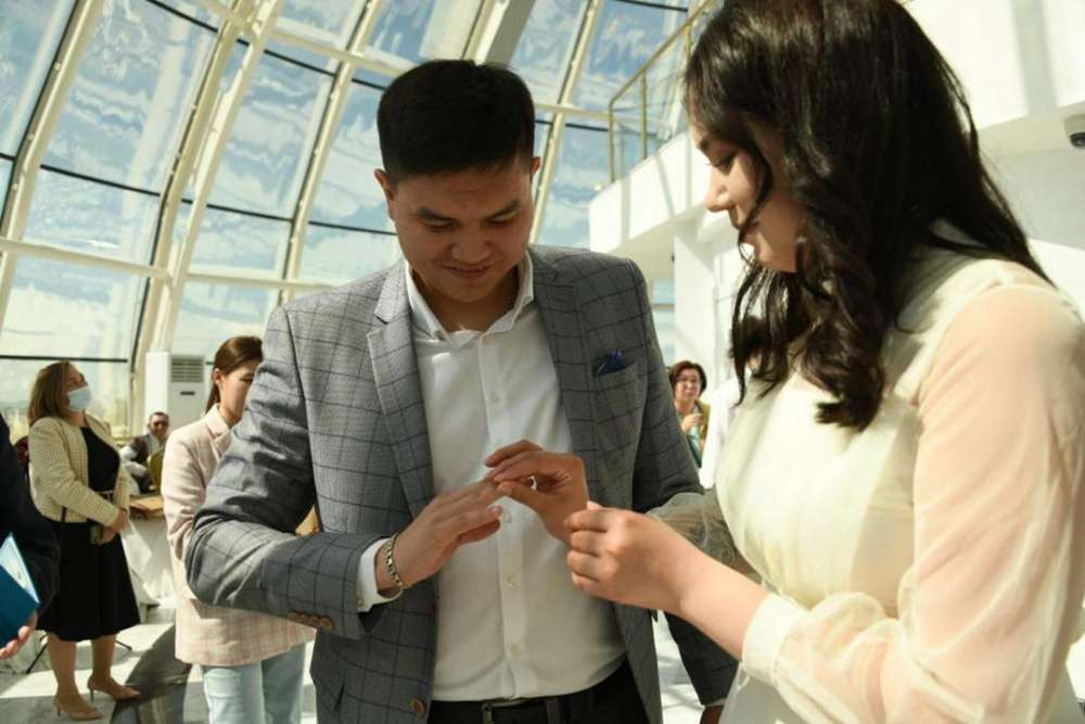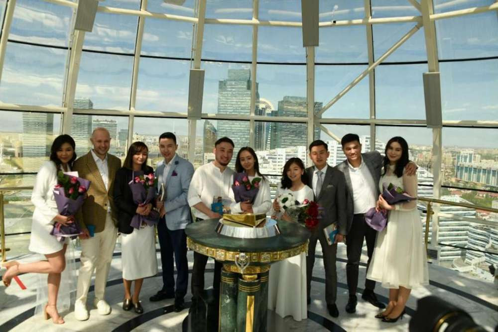 В Нур-Султане 15 пар молодожёнов получили свидетельства о браке на вершине монумента "Байтерек", передаёт