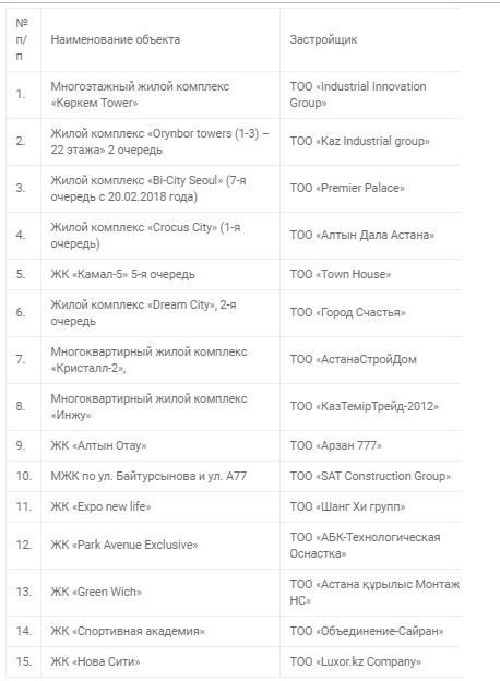 Власти Астаны предостерегли дольщиков. Так, согласно требованиям пункта 2 статьи 3 Закона запрещается привлечение денег физических и юридических лиц для строительства жилых домов (жилых зданий) в нарушение требований, установленных законом.