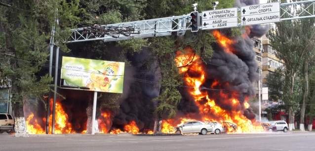 Бензовоз охватило огнем, который перекинулся на находящиеся рядом 12 автомашин и на восьмиэтажный жилой дом по проспекту Сейфуллина. Площадь пожара составила 1000 квадратных метров. Но никто, кроме водителя, не пострадал.