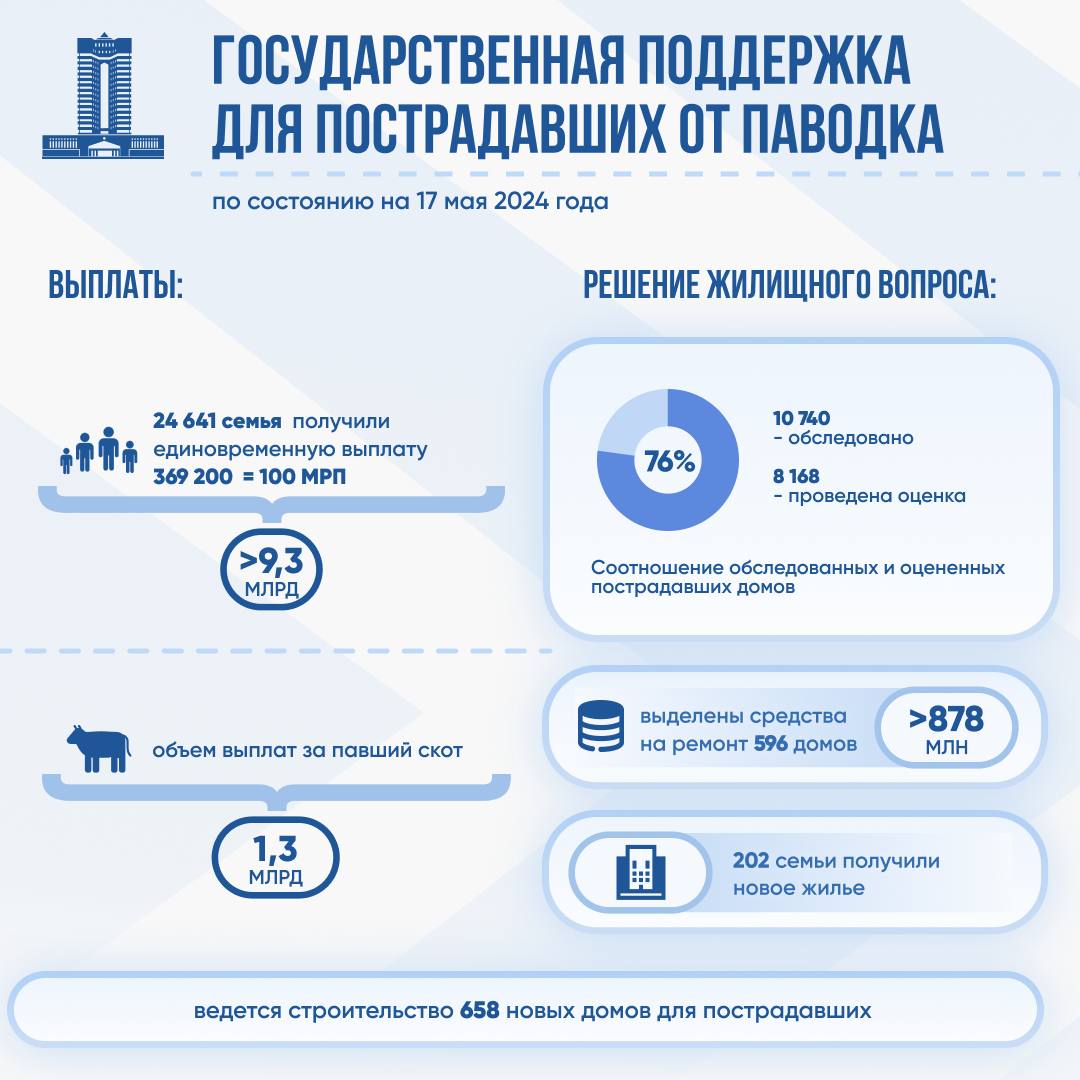 "По состоянию на 17 мая 202 семьи уже получили дома и квартиры взамен разрушенного жилья. В Актюбинской, Западно-Казахстанской, Северо-Казахстанской и Павлодарской областях ведется строительство 658 новых домов для пострадавших граждан.