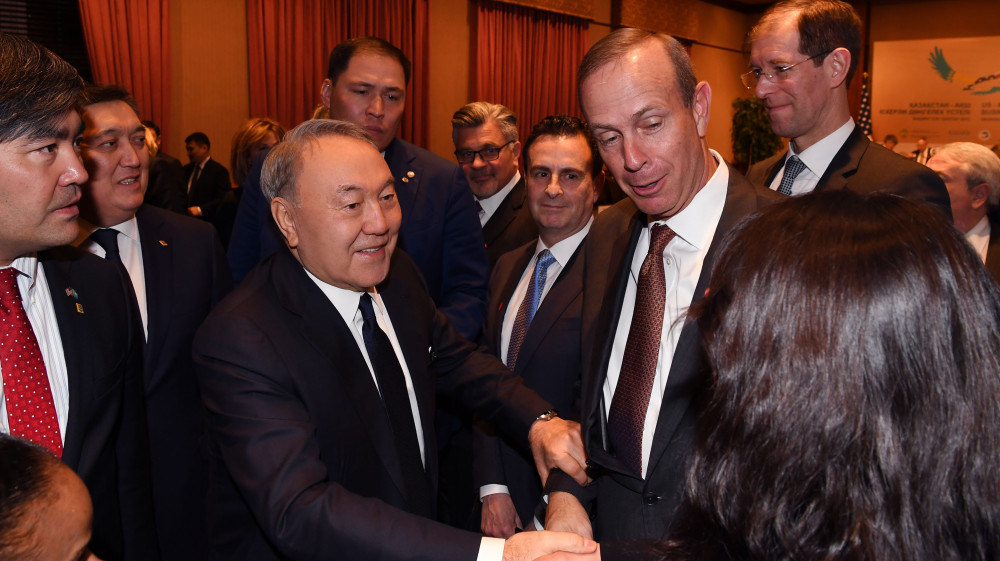 "Америка занимает второе место по объемам прямых инвестиций в казахстанскую экономику. За годы независимости со стороны ваших компаний в Казахстан инвестировано более 50 млрд долларов. За прошлый год товарооборот между нашими странами составил около 2 млрд долларов. В нашей стране с участием американского капитала успешно осуществляет деятельность более 500 компаний в энергетике, транспорте, инновациях, медицине и других сферах. Среди наших крупных партнеров – "Шеврон", "Эксон Мобил", "Дженерал Электрик", "Хэллибёртон" и другие компании", - сказал Нурсултан Назарбаев.