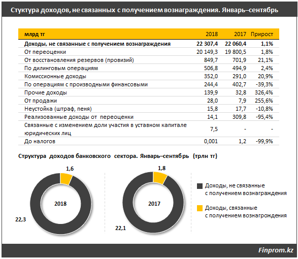 В структуре доходов, не связанных с получением вознаграждения, основной источник денежных потоков — переоценка активов: 20,1 трлн тенге (годом ранее — 19,8 млрд тенге). Следом идёт восстановление резервов: 849,7 млрд тенге (годом ранее — 701,9 млрд тенге). Замыкают тройку наиболее доходных статей дилинговые операции — 506,8 млрд тенге против 494,9 млрд тенге годом ранее.