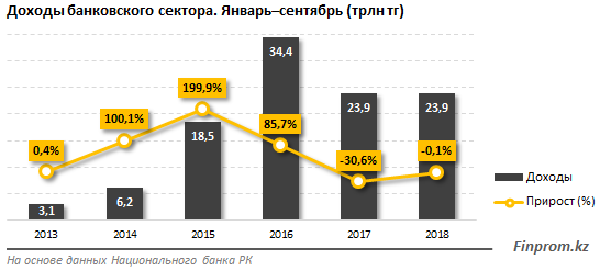 До позапрошлого года в соответствующем периоде банковские доходы активно росли, увеличивались год от года и темпы роста — до 2015 года, оставаясь на высоком уровне и в 2016 году (85,7%). Так, в январе–сентябре 2013 года сумма доходов составляла 3,1 трлн тенге, а в 2016 году - 34,4 трлн тенге.