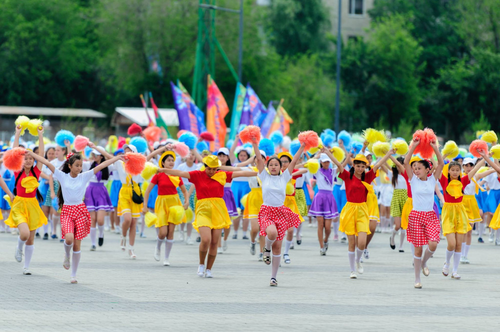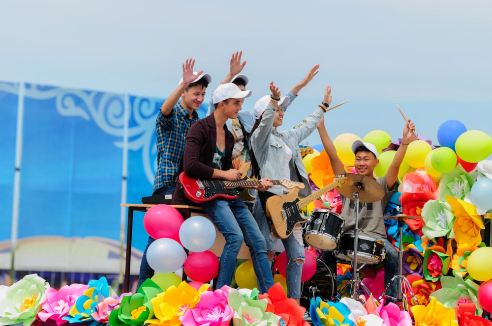 Венцом праздника стало прохождение юных домбристов, барабанщиков, гитаристов, флагоносцев, черлидеров, мажореток, духовых оркестров, танцевальных коллективов.
