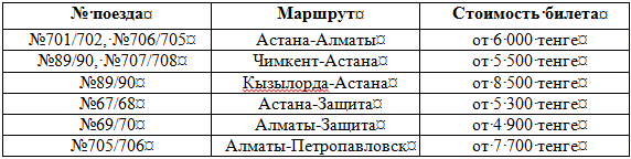 Следует отметить, что ближе к дате отправления поезда и при увеличении спроса стоимость билетов будет расти. При этом сохраняются действия ранее введенных дисконтных карт на проезд в поездах «Тұлпар-Тальго», которые применяются по следующим категориям: «Кұрмет», «Жастар», «Саяхатшы», «Ардагер», «Ардагер+», «Ардақты ана» и «Қамқор», сообщает пресс-служба АО «Пассажирские первозки».