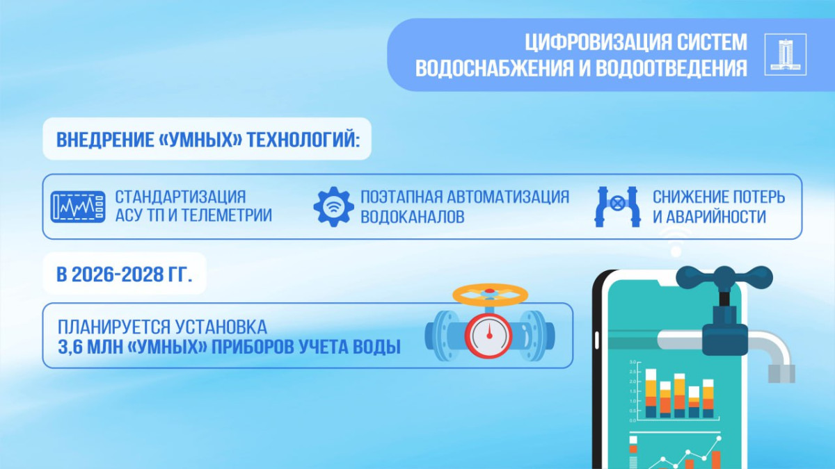 На заседании Правительства вице-министр промышленности и строительства Куандык Кажкенов подчеркнул, что цифровизация является неотъемлемой частью модернизации систем водоснабжения и водоотведения и необходимым условием обеспечения устойчивой эксплуатации, системного управления, контроля и снижения потерь в коммунальной инфраструктуре. По его словам, в связи с этим проводится работа по стандартизации требований к системам автоматизации (АСУ ТП) и приборам учета с технологией телеметрии для автоматического сбора показаний через каналы связи.