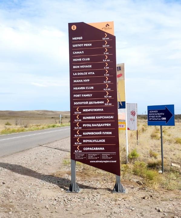 По итогам проведенных работ будет установлена около 40 единиц указателей и стелл вдоль основных дорог ведущих к туристским локациям Алматинской области, в том числе к озеру Иссык, плато Ассы в Тургеньском ущелье, объект ЮНЕСКО - городище "Талхиз", заповедник музей "Танбалы" в Жамбылском районе, петроглифы на урочище р. Или "Тамгалы тас", оз. Кольсай и Кайынды, ущелье Саты, горячий источник "Музтау" в Кегенском районе, Чарынский и Черный каньон, а также внутри города Конаев и на побережье Капчагайского водохранилища.