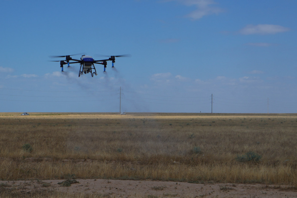 В обработке таких огромных площадей региона занято свыше 360 человек. Это инспекторы, специалисты из районов и городов Туркестанской и других областей, прогнозного центра и даже местные неравнодушные жители. Работа идет пешим ходом, на машинах, с помощью самолетов и беспилотников. Итого с земли обрабатывается 162 тыс. га, с воздуха – 107 тыс. га, с применением ранцевого опрыскивателя – 1 тыс. га, беспилотниками – 1,4 тыс. га.