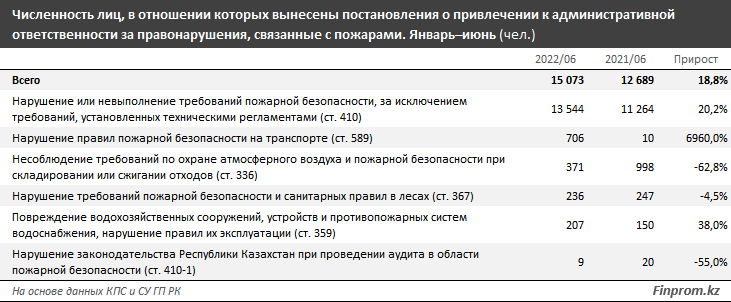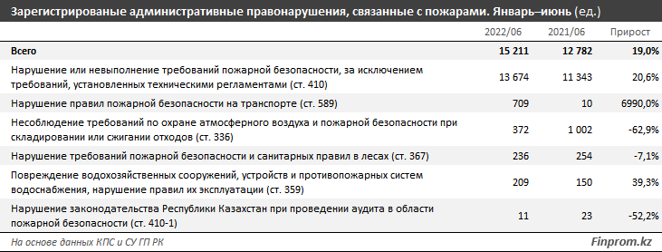 Административных правонарушений, связанных с пожарами, в целом по стране по итогам первого полугодия текущего года зарегистрировали 15,2 тысячи — сразу на 19% больше, чем годом ранее, сообщает BaigeNews.kz со ссылкой на Finprom.kz.