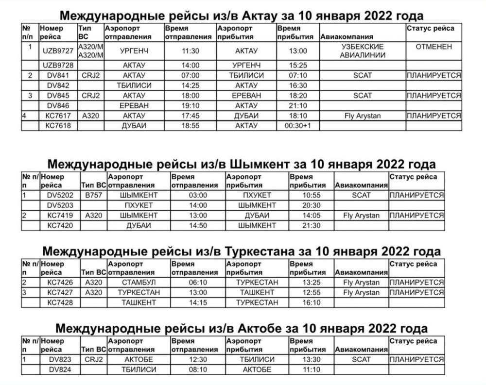 Из/в городов Актау, Шымкент, Туркестан, Актобе планируется выполнение 15 международных рейсов в Дубай, Стамбул, Тбилиси, Ереван, Ташкент, Пхукет и из Алматы и Актау отменено выполнение 14 рейсов в/из Стамбул, Дубаи, Абу-Даби, Ташкент, Москва, Киев, Ургенч.