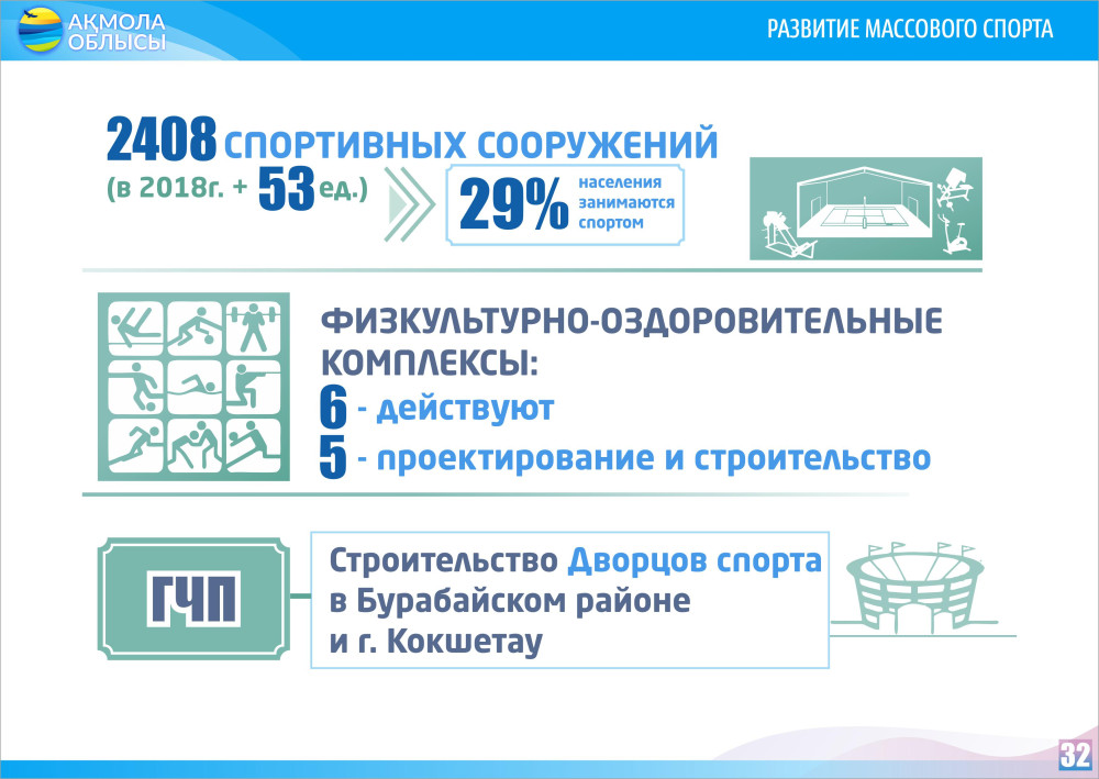 и других спортивных объектов во многих населенных пунктах области. На сегодня ведется строительство ФОКа в Астраханском районе, проектируется стоительство 4 ФОКов в с. Акмол и п. Косшы Целиноградского, Биржан сал и Ерейментауском районах.