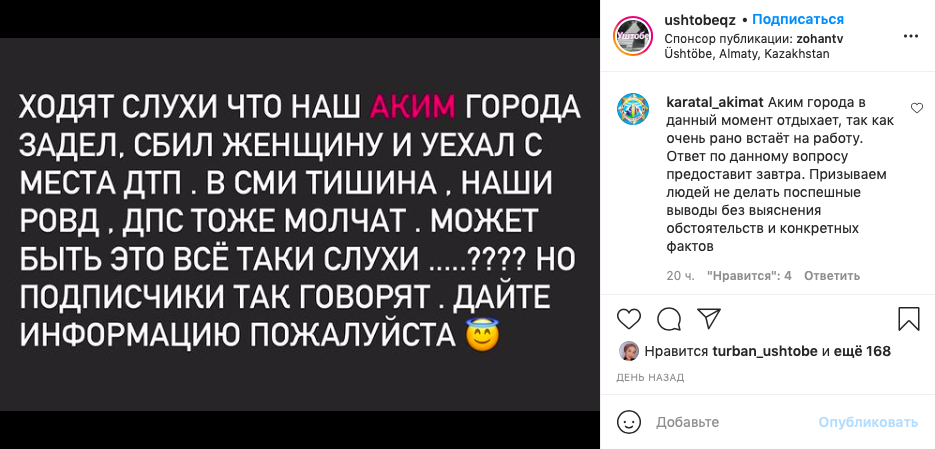 Ранее в соцсетях появилась информация о том, что чиновник сбил женщину и скрылся с места ДТП. Общественность ждала реакции акима, но в комментариях под публикацией вместо Сагынбека Карбузова решил отписаться районный акимат.