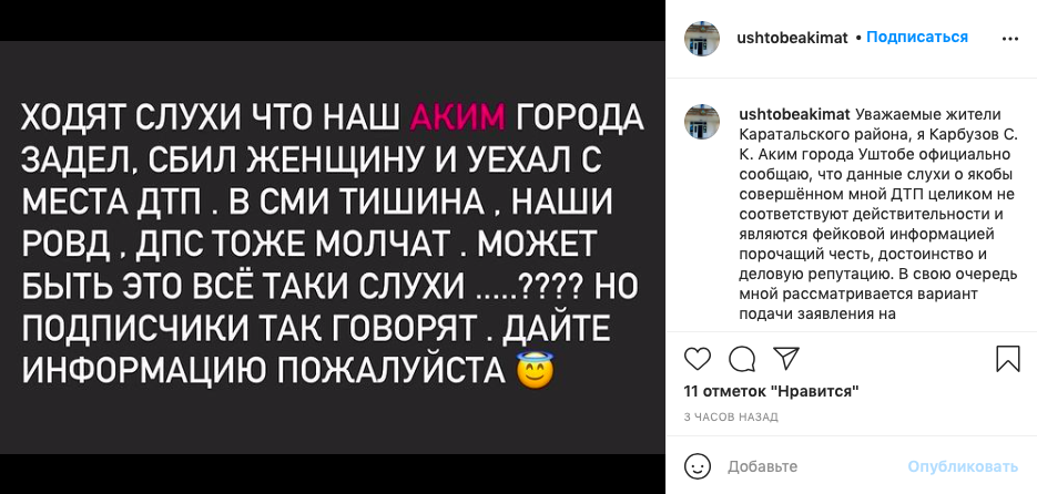 "Уважаемые жители Каратальского района, я Карбузов С. К. - аким города Уштобе - официально сообщаю, что данные слухи о якобы совершенном мной ДТП целиком не соответствуют действительности и являются фейковой информацией, порочащей честь, достоинство и деловую репутацию", - опубликовано на официальной странице акимата в Instagram.