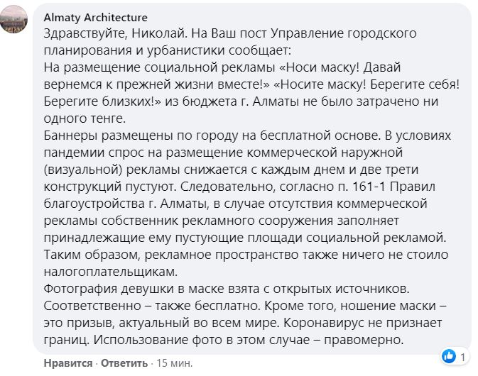 "Ну и под настроение поста Куата Камали о том, что девушка в маске малость задолбала, скажу, что этот посыл, конечно, из благих намерений. Я ничего не имею против. А вот некоторые в комментариях в шутку говорят, мол, денег хватило только на одну девушку. А я вам больше скажу – девушка эта в абсолютно свободном доступе на ресурсе freepik и других. Доступная в общем. Причем в разных позах. Так что денег ого как хватило, чтоб за один день забить все конструкции этим изображением", - сообщил пользователь Facebook Кирилл Лавров.