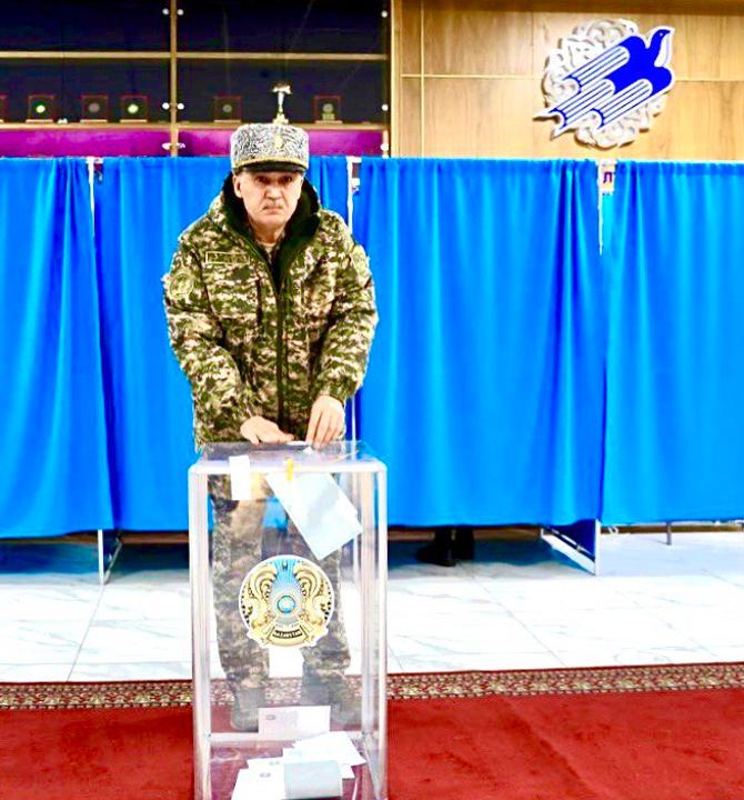 Министр обороны генерал-полковник Руслан Жаксылыков, как истинный военный, прибыл на избирательный участок сразу после подъёма, одним из первых.