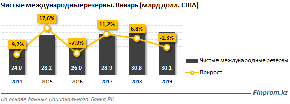 Золотовалютные резервы Национального банка на конец января 2019 года снизились на 2,4% за год и составили 30,6 млрд долларов. За аналогичный период предыдущего года золотовалютные резервы достигли 31,3 млрд долларов, увеличившись за год на 6,7%.