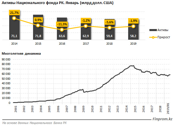 Активы Национального фонда РК на конец января 2019 года достигли 58,2 млрд долларов, сообщает finprom.kz.