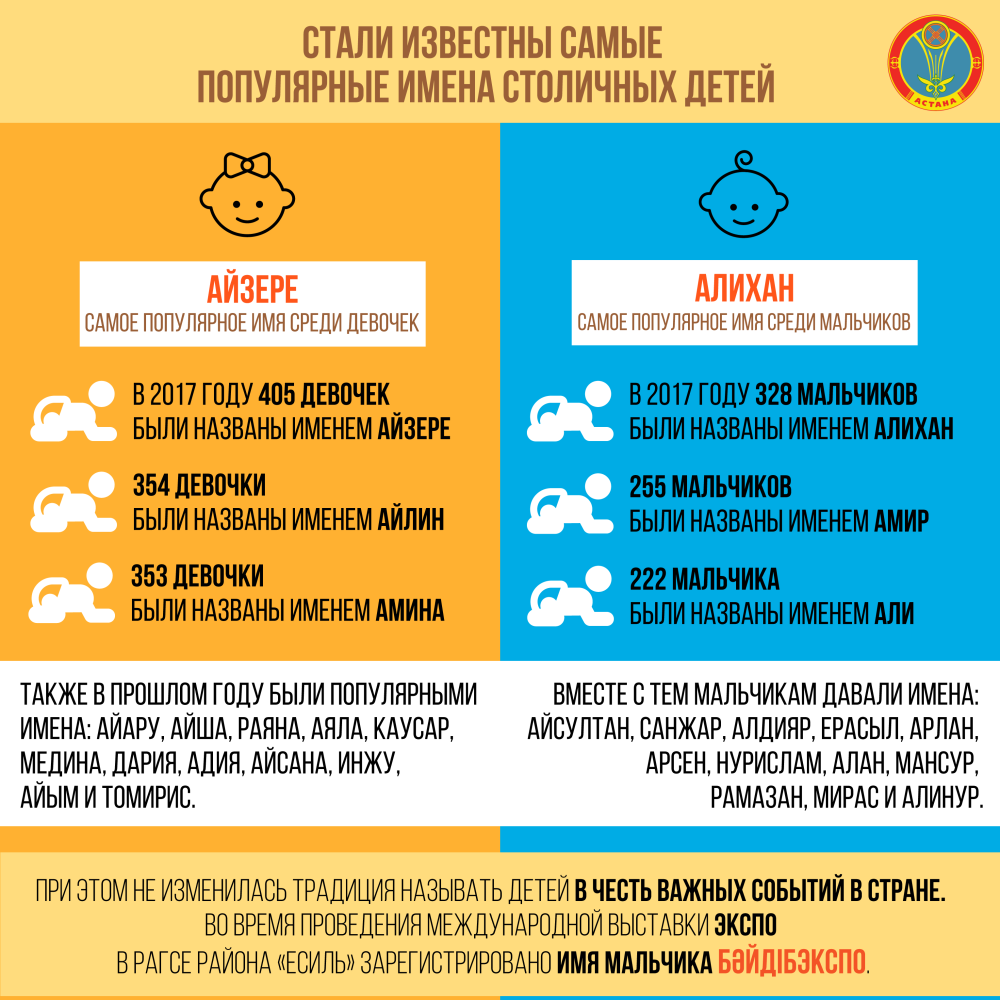 Алихан и Айзере стали самыми популярными именами в Астане, которыми чаще всего называли новорожденных в прошлом году, передает официальный сайт столичного акимата.