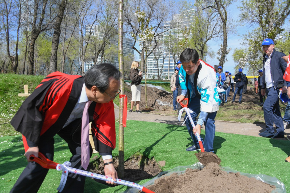 Первые японские деревья в ходе торжественной церемонии сегодня высадили аким города Бауыржан Байбек и президент японской транснациональной корпорации "Tokyo Rope Internationa" Сато Казунори.