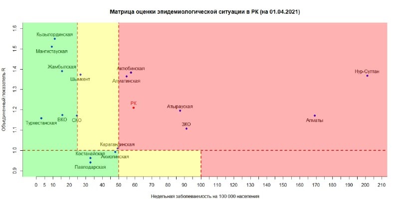 Опубликована матрица оценки эпидемиологической ситуации в регионах Казахстана на 1 апреля 2021 года, передает BaigeNews.kz.