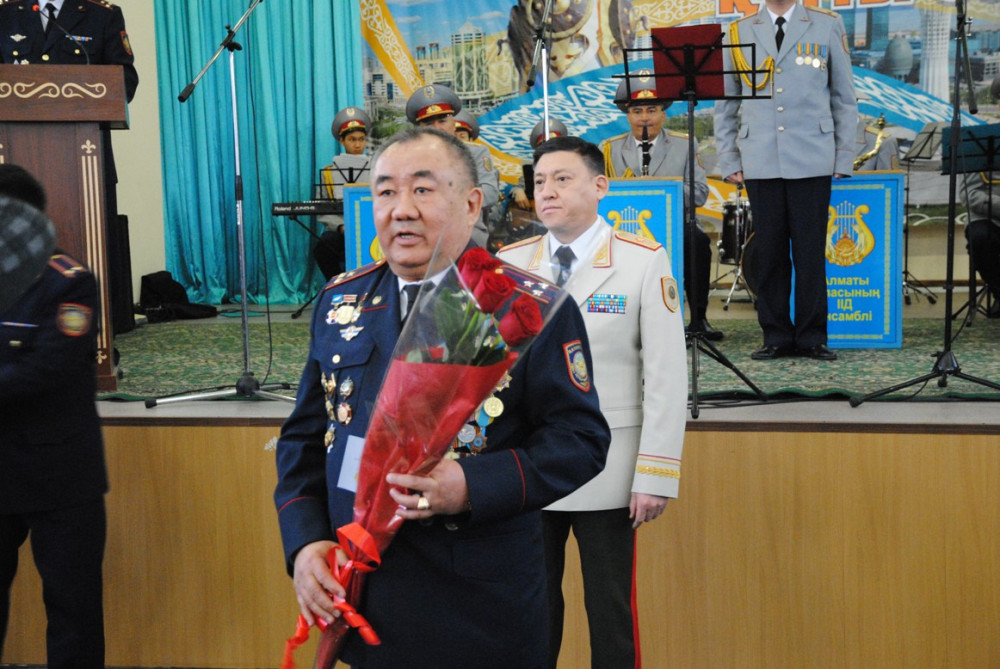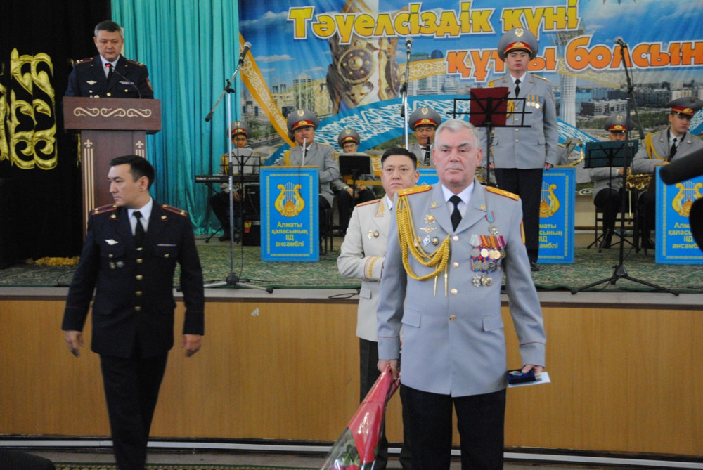 «25-летие независимости Казахстана – это знаковое историческое событие для нашей страны. От имени руководства Министерства внутренних дел и от себя лично разрешите поздравить личный состав ДВД города Алматы, ветеранов органов внутренних дел, родных и близких наших сотрудников и ветеранов с национальным праздником – Днем независимости Казахстана. Следует отметить, что благодаря усилиям Главы государства и всех казахстанцев за столь короткий период мы смогли построить современное сильное государство и стали полноправным участником мирового сообщества. Безусловно, динамичное развитие нашего государства было бы невозможным без обеспечения должного правопорядка и безопасности, защиты прав и интересов граждан и государства, на страже которых стоят органы внутренних дел. История казахстанской полиции насчитывает бесчисленное количество примеров героизма, мужества и самоотверженности личного состава, которые находясь на переднем крае борьбы с преступностью, ежедневно подвергают свою жизнь и здоровье огромному риску. За годы независимости Казахстана при исполнении служебного долга погибли 837 сотрудников органов внутренних дел, почти 3 тысячи получили ранения. За проявленную отвагу и образцовое исполнение служебных обязанностей около 1100 сотрудников награждены государственными наградами и, к сожалению, 115 из них посмертно. Два офицера удостоены высокого звания «Халық қаһарманы» - капитан полиции Газиз Байтасов и полковник Кайрат Умбетов», - особо отметил Берик Бисенкулов.