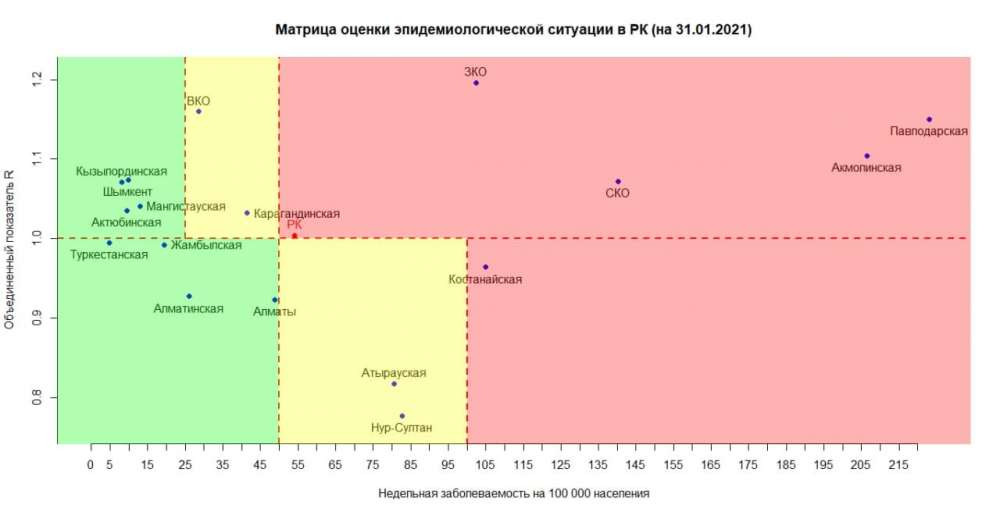 Обновлена матрица оценки эпидемиологической ситуации в регионах Казахстана на 31 января 2021 года, передает