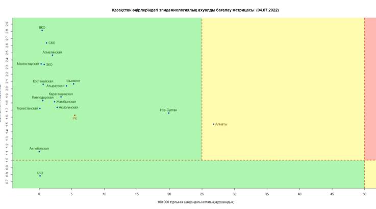 Межведомственная комиссия по нераспространению КВИ опубликовала матрицу оценки эпидемиологической ситуации в регионах Казахстана на 4 июля.