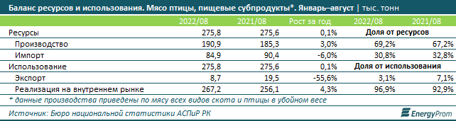 По итогам января–августа 2022 года местные компании обеспечили спрос (реализацию на внутреннем рынке плюс экспорт) на мясо птицы и пищевые субпродукты на 69,2 процента, против 67,2 процента годом ранее.