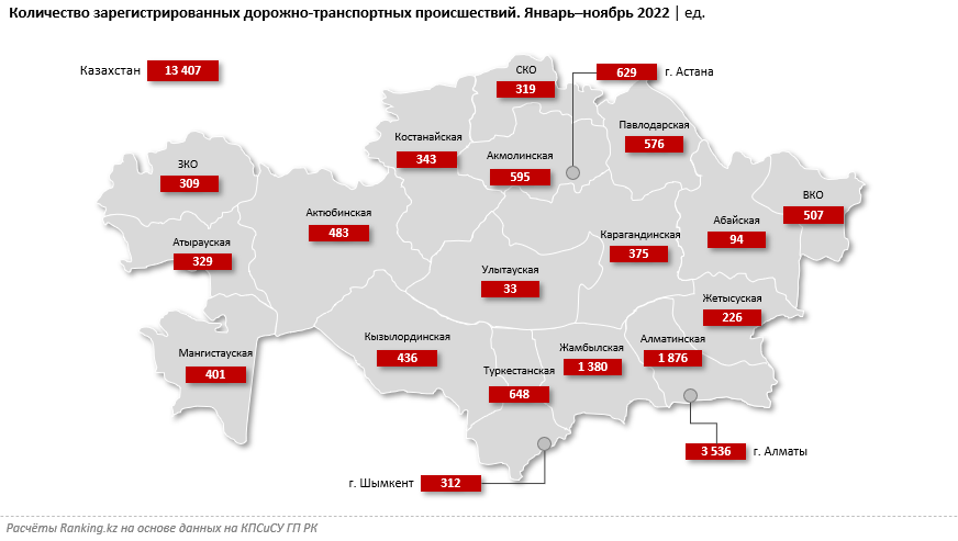 Меньше всего ДТП было зафиксировано в новообразованных областях — Улытауской, Абайской и Жетысуской (33, 94 и 226 случаев соответственно). Низкие показатели аналитики связывают с тем, они были образованы лишь в середине 2022 года.
