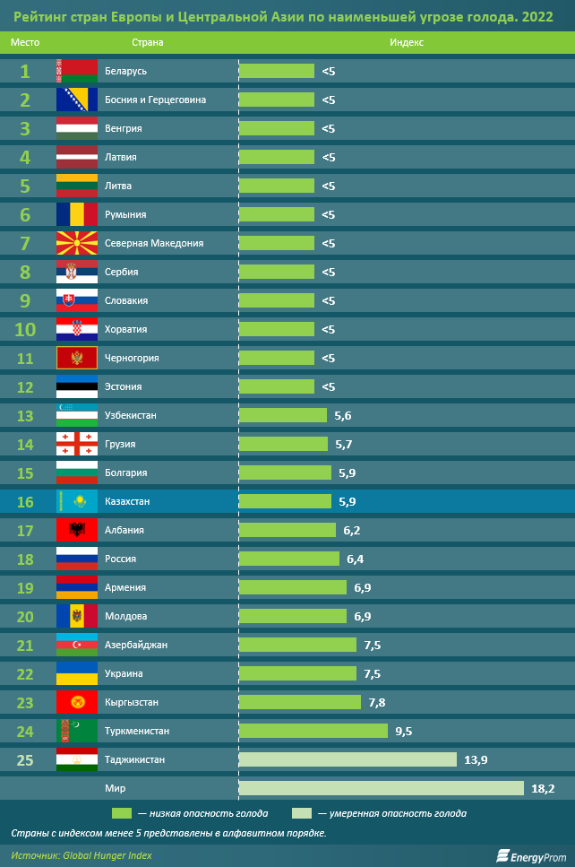 В рейтинге стран по наименьшей угрозе голода в 2022 году среди 25 стран Европы и Центральной Азии Казахстан занял 16-е место. Индекс голода в РК составил 5,9. Чем меньше индекс, тем менее страна подвержена опасности голода. При этом отметим: по данным рейтинга, в 2014 году индекс страны составлял 5,8 (то есть был чуть меньше, и, соответственно, ситуация была чуть лучше, чем в 2022-м), однако ещё в 2007 году показатель был заметно хуже — 11,6.