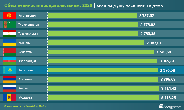 По данным Our World in Data, в 2020 году в Казахстане в среднем потребляли 3,4 тысячи килокалорий на душу населения в день, на 1,4% больше, чем годом ранее.
