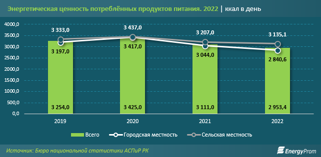 По данным Бюро национальной статистики АСПиР РК, по итогам 2022 года население РК потребляло в среднем 3 тысячи килокалорий на душу населения в день. Это на 5,1% меньше, чем годом ранее. Отмечается, что в городской местности показатель составлял 2,8 тысячи килокалорий, в сельской местности — 3,1 тысячи килокалорий. При этом минимальная потребность составляла 1,9 тысячи килокалорий в день на душу населения.