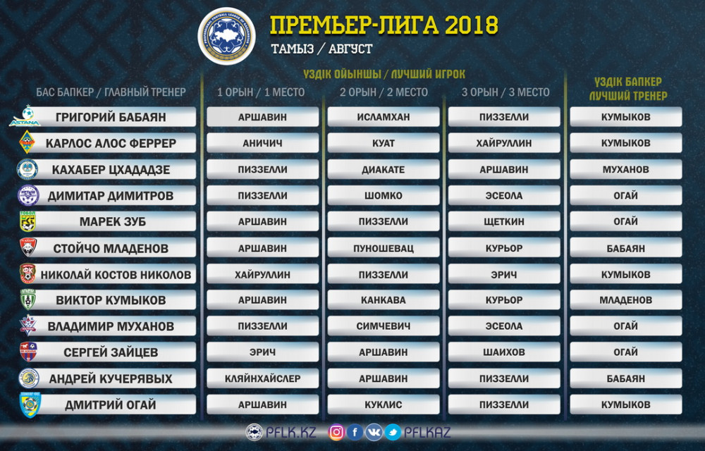 Профессиональная футбольная лига Казахстана подвела итоги традиционного опроса на лучшего главного тренера и футболиста в августе, сообщает BNews.kz со ссылкой на пресс-службу ПФЛК.