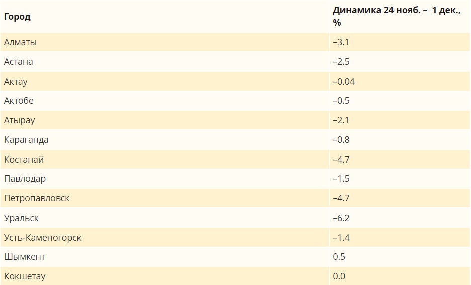 На 1 декабря цены на аренду ещё не вернулись на доажиотажный уровень (начало сентября). Наибольший разрыв остаётся в Костанае (+24,6%), Павлодаре (+16,9%), Алматы (+16,1%), Астане (+11,7%). В Караганде, Актобе, Актау, Атырау цены почти пришли в норму, разница с сентябрём составляет не более пяти процентов.
