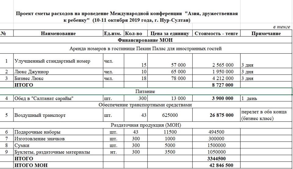 "Видимо, это дети должны были лететь бизнес-классом, жить в отеле за 78 000 тенге за сутки, и есть ужины за 25 000 и обеды по 13 000 тенге каждый? Для сравнения: в Казахстане размер пособия по инвалидности меньше, чем ночь в таком отеле, а месяц занятий ребенка в секции или кружке стоит как один такой обед или ужин.