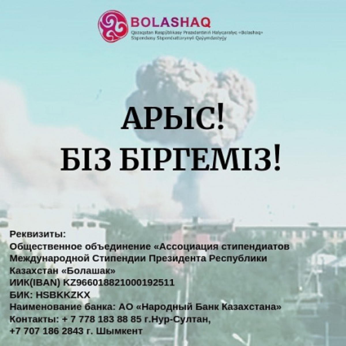 Ассоциация «Болашак» объявляет сбор средств для пострадавших от взрывов на территории военных складов в городе Арысь Туркестанской области, сообщает BNews.