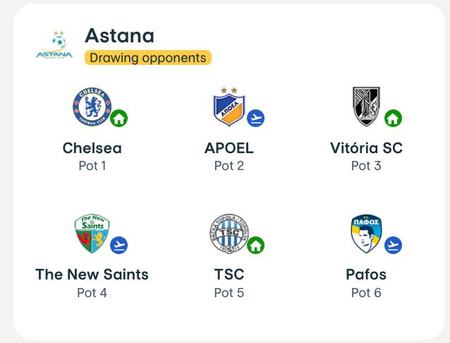 Соперниками "Астаны" будут английский "Челси", кипрские АПОЭЛ и "Пафос", португальская "Витория" (Гимарайнш), валлийский "Нью-Сейнтс" и сербский ТСЦ. Всего казахстанская команда проведет шесть матчей: три — дома, три — в гостях. Дома "Астана" сыграет с "Челси", "Виторией" и ТСЦ, а в гостях встретится с АПОЭЛом, "Нью-Сейнтс" и "Пафосом".