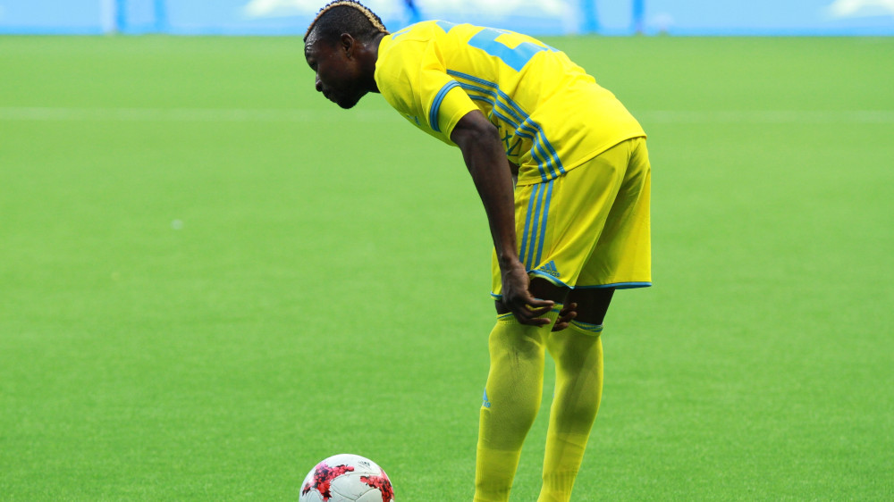 Астана забирает контроль над мячом, подача с левого фланга. Отскок, мяч подбирает Твумаси, удар и мяч идёт мимо ворот. Не хватило точности игроку.