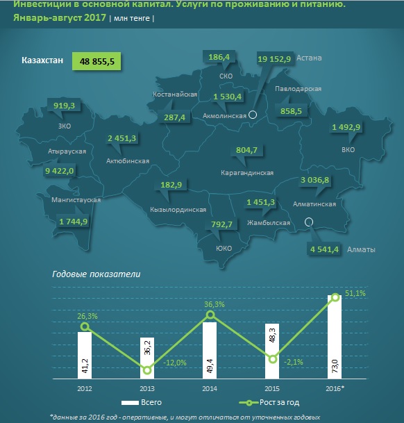 На втором месте по объемам инвестиций в основной капитал в сегменте услуг по проживанию и питанию - Атырауская область (9,4 млрд тенге, рост к прошлогодним показателям сразу в 3,6 раза). Замыкает тройку лидеров Алматы (4,5 млрд тенге, что на 14% меньше, чем в аналогичном периоде 2016, когда город усиленно инвестировал в сферу гостеприимства перед Универсиадой, прошедшей в южной столице с 29 января по 8 февраля 2017).