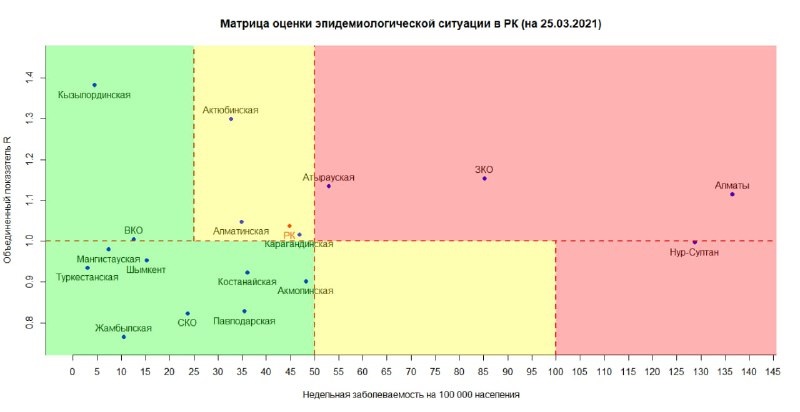 Опубликована матрица оценки эпидемиологической ситуации в регионах Казахстана на 25 марта 2021 года, передает BaigeNews.kz.