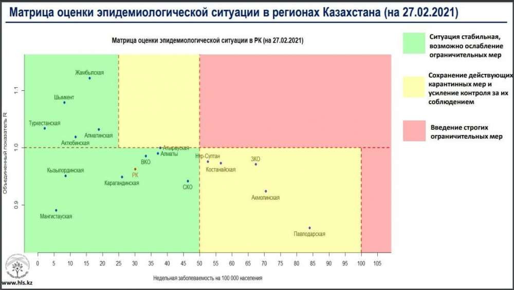 Опубликована матрица оценки эпидемиологической ситуации в регионах Казахстана на 27 февраля 2021 года, передает