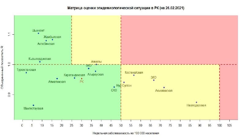 Опубликована матрица оценки эпидемиологической ситуации по коронавирусу в регионах Казахстана на 26 февраля 2021 года, передает
